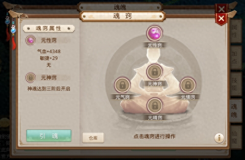 神魂之外还有魂窍。魂窍属性需要注入太阴之气来激活,太阴之气通过在地藏王处进行冥海引魂获得。如下图所示,魂窍一共5个,神魂提升到一定阶数开启对应魂窍: