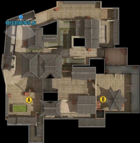 B仓主攻潜伏者到达B仓口时可以迅速扔一颗B仓烟,并让一名狙击手透过B仓窗户架点B窗,或者是让一名步枪手持续打点。