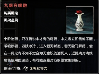 当然,想迷翻仇家还神不知鬼不觉。那迷药就不能缺斤少两!为了能好哈蹂躏肉票,为了能卖个好价钱,迷药定要买上上品。这里小编推荐各位侠士购买这“九幽夺魄散”,贵是贵了点儿,但TM“疗效”好啊!