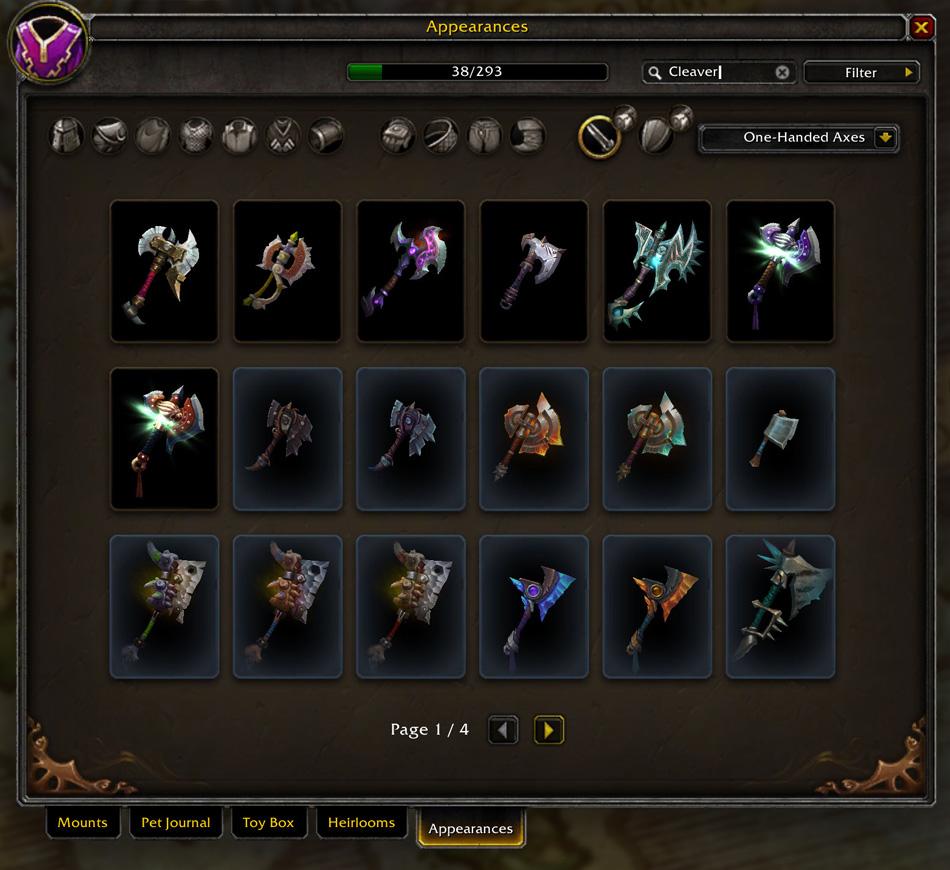 我们有多种方式来查看所有的外观—看到窗口顶部的小按钮了吗,你可以根据不同的装备部位来缩小显示的外观范围。继续翻页,你还能够看到那些尚未解锁的装备外观,它们将呈现为灰色。另外,右键单击已解锁的装备外观可以将其设定为个人喜好,这样它们就能出现在收藏页面的前列位置了。