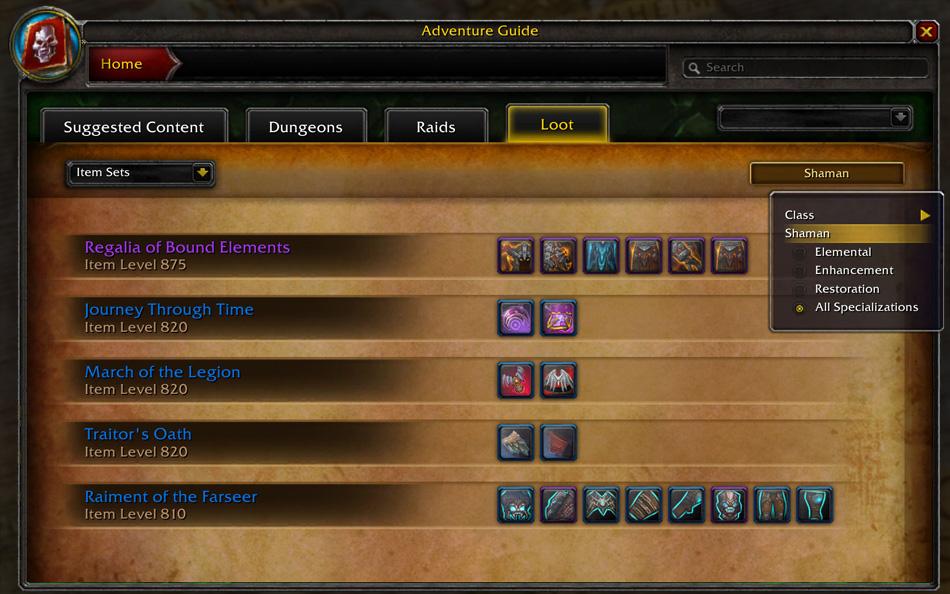千万别忽略了拾取界面上方的按钮。你可以通过点击其下拉菜单来通过专精以及通过职业、专精和装备位置来对传奇装备进行筛选。按住ctrl键并点击装备将立即打开试衣间,这样你就能提前预览到角色装备后的样子。