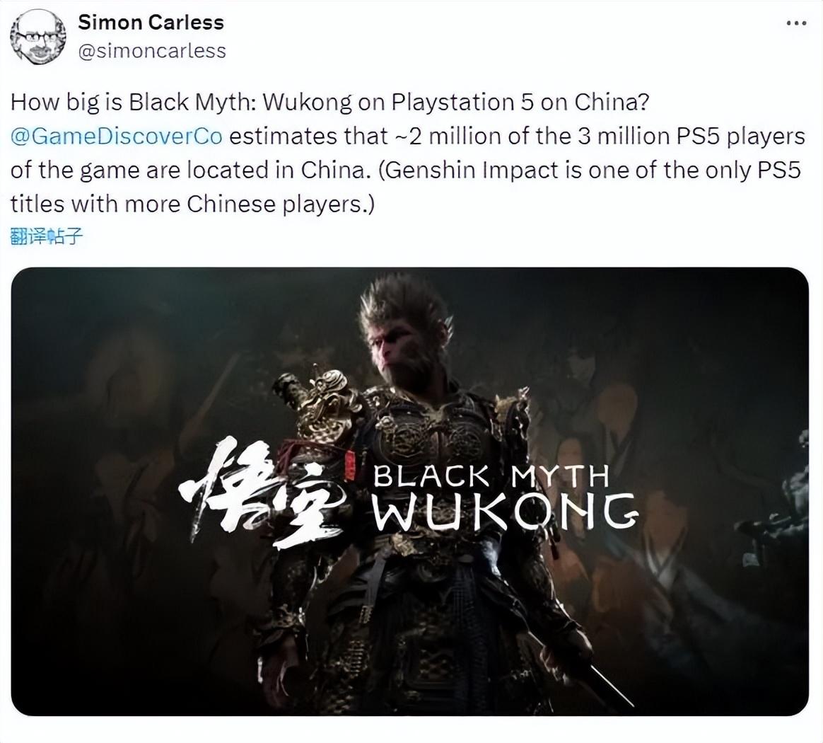 另一家游戏数据分析公司GameDiscoverCo的研究员Simon Carless发推表示,《黑神话:悟空》PS5玩家数量为300万人,其中200万为中国玩家。