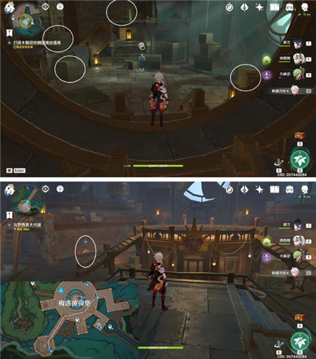 4、随后与格内薇芙对话,接着需沿着楼梯向上爬去往平台一层,之后长按左键瞄准储存罐并进行投掷;