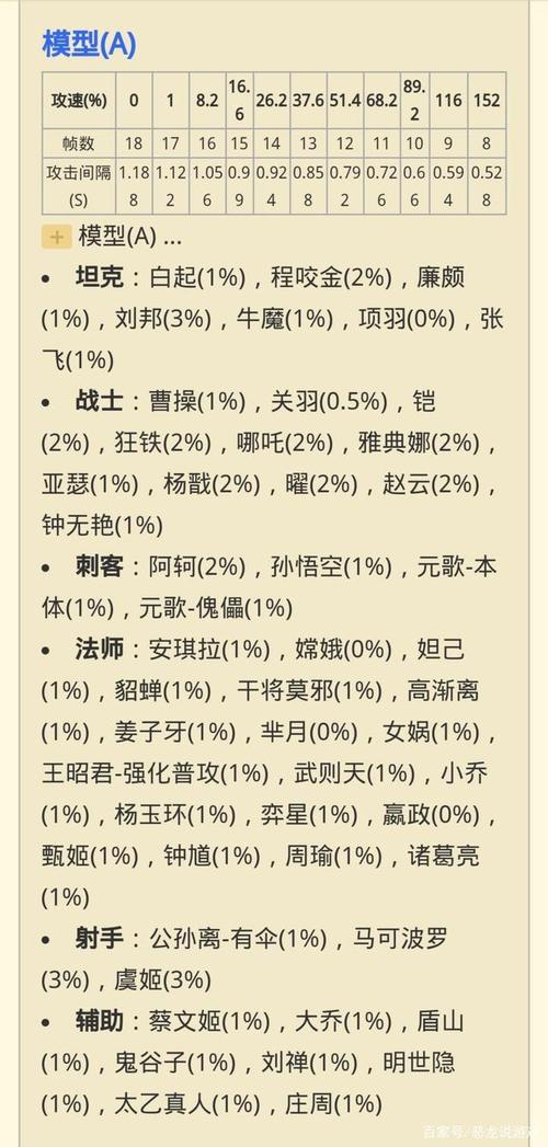 这表格里的“攻速模型”指的是不同类型的英雄,他们的攻速阈值都是一样的,比如坦克、战士的攻速模型都是A,他们的攻速阈值是一样的,都是0% – 1% – 8.2% – 16.6% – 26.2% – 37.6% – 51.4% – 68.2% – 89.2% – 116% – 152%。