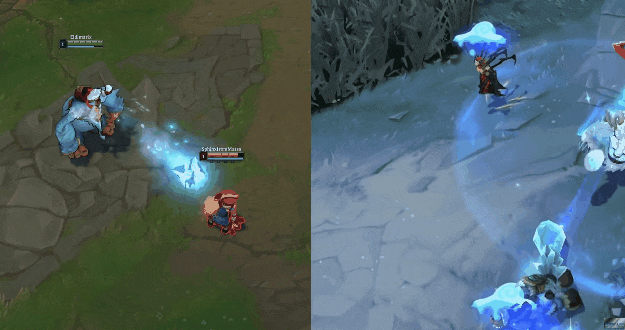 同样是吞噬野怪,但是新版努努的动作更为的粗暴,看样子是雪天更为的寒冷,威朗普更为的饥饿了。从技能动作上来看,努努Q技能的释放速度会更快。