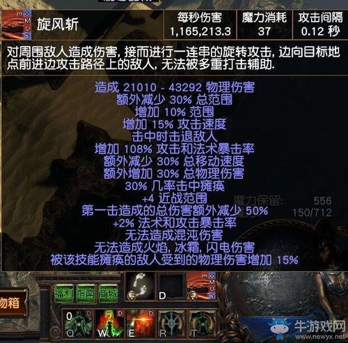接下来,就是技能搭配了! 这可是重头戏!我这次用的是 旋风斩-近战物理伤害-残暴-瘫痪-增加暴击几率-集中效应/增大范围 这套连法,保证伤害爆表,还能控制怪物,简直不要太爽!