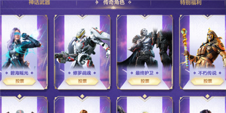 本次参与投票的武器和角色皮肤分为三组,分别是神话级武器、传说级角色皮肤和特别福利。