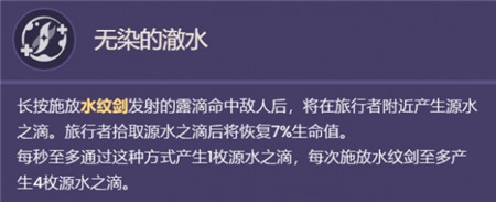 长按施放水纹剑发射的露滴命中敌人后,将在旅行者附近产生源水之滴。旅行者拾取源水之滴后将恢复7%生命值。