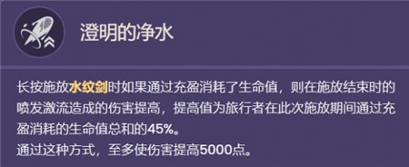 长按施放水纹剑时如果通过充盈消耗了生命值,则在施放结束时的喷发激流造成的伤害提高,提高值为旅行者在此次施放期间通过充盈消耗的生命值总和的45%。