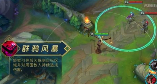 费德提克在原地短暂引导后,闪烁到目标地点,召唤群鸦风暴,在一段时间内,对范围内的敌人持续造成魔法伤害。