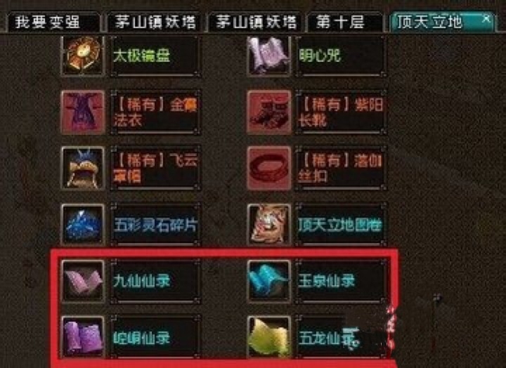 3、茅塔10层掉落。进入茅山镇妖塔,击败第10层BOSS顶天立地,可以掉落心法书:(力士)九仙仙录、(游侠)玉泉仙录、(法师)崆峒仙录或(符咒)五龙仙录。