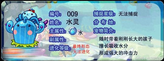 然后就是水属性的初始宠物啦,水灵,是水蓝蓝的最终进化形态,水蓝蓝进化的波波拉是很多女孩的最爱,也是女孩子选的很多的初始宠物。水灵超进化后进化为圣水守护,体型魁梧了很多,但也多了一丝霸气,实力上自然也是变得更强了。