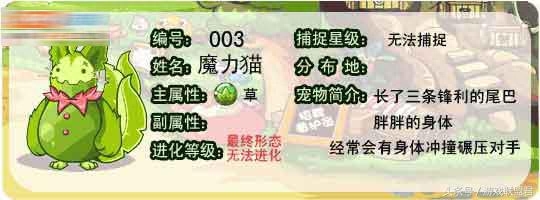 最后就是魔力猫了,草系初始宠物,喵喵的最终进化形态。小编觉得是三个初始宠物中最丑的,但是他的睡眠粉可真的是很厉害很烦人啊。然而他的超进化形态却是三个宠物里最帅的:武斗酷猫。小编仍然记得,洛克王国里有生蛋系统,可以让魔力猫遗传到当年神技:电弧。首先出招,而且对克制自己的翼系有很好的克制效果。