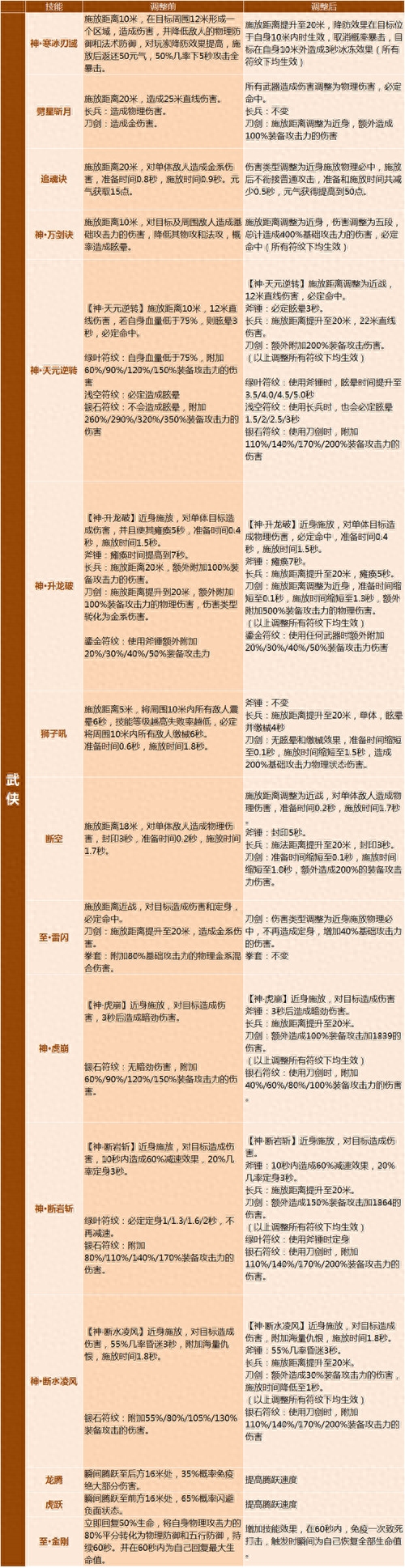 本次技改采纳了玩家的部分建议,从职业定位出发进行了调整优化。如武侠调整了大部分技能的使用效果,使其在装备不同类型的武器时可以获得不同的技能特效,同时增强了武侠的保命能力及机动性。法师则提升了技能释放的流畅度,同时提高了免疫能力,使其在战斗中得以自保。巫师也大幅增强了技能的施放手感,调整了部分技能的释放效果使其更适应现阶段的玩家属性,同时增加了其爆发伤害和机动性。