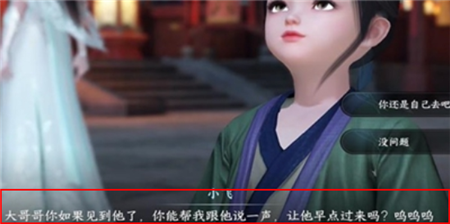 2.接着在和NPC【小飞】的交谈当中能够得知它的父亲不愿意回去,在向小伙伴们求助能不能帮她寻找父亲;