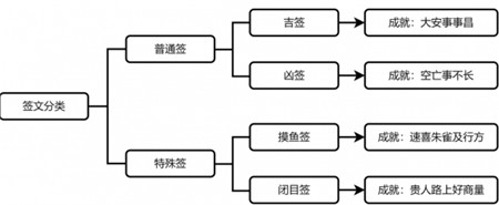 占卜可获得的签文分类如下,共有11种签文,6种吉签,3种凶签,1种摸鱼签,1种闭目签。