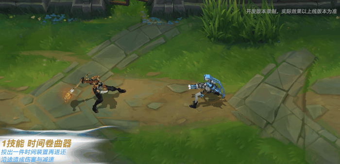 艾克挥舞时空棒,命中同一个目标3次时会出现橙色菱形印记附带倒计时,并额外造成伤害,如目标为英雄则获得额外移速,尾部会有橙色胶卷拖尾。