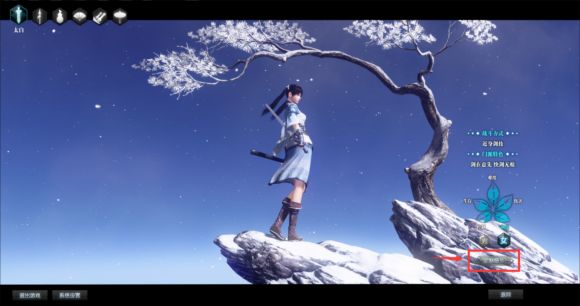 Step 1 进入游戏,选择门派、性别后,点击“定制细节”,进入捏脸界面。