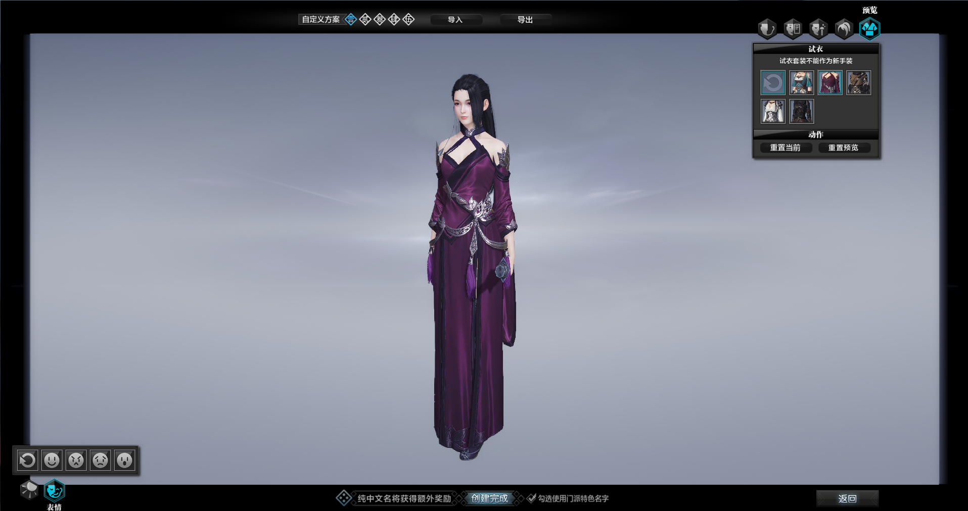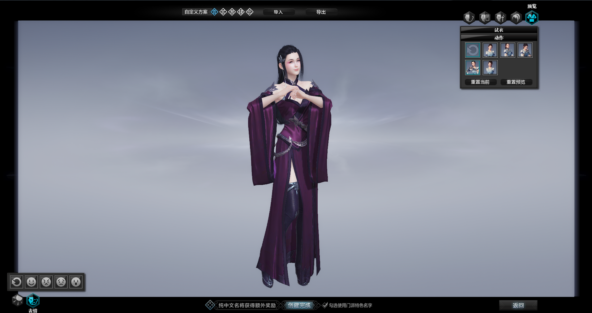 捏脸界面右上角“预览”中可以查看角色身穿不同外装和动作的呈现效果。