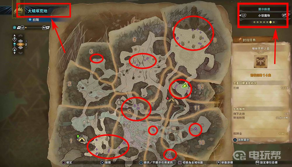在"怪物猎人世界"游戏中,巨峰是另一个称呼巨蜂的名字。你可以在"大蚁冢荒地"找到它。通过调整地图的怪物显示设置,将其设定为显示"小型魔物"的动向。此时,地图上的紫色菱形标记就代表它的位置。如图所示,你可以在8区、10区、12区等多个地方找到它。